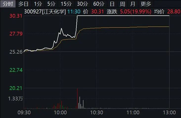 化工产业链早间全线上涨,个股出现涨停潮,江天化学(300927)直线20%封板。
