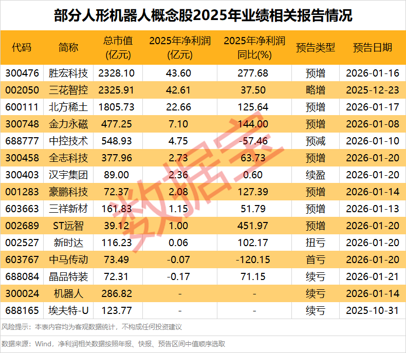 截至1月21日,人形机器人概念股中,已有15股发布2025年业绩相关报告。除机器人、埃夫特-U两股外,其余13股均给出了业绩区间预测。