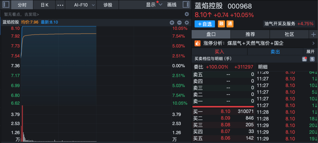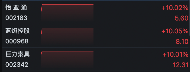 油气开采、天然气等细分板块指数创历史新高,可燃冰、燃气、页岩气等板块指数也创多年新高。巨力索具高开后仅约1分钟垂直涨停,蓝焰控股也仅约2分钟直线涨停,洲际油气、胜利股份、中泰股份等涨停或涨超10%。