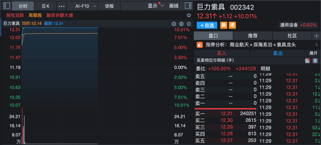 经过短暂调整之后,国防军工股今日早盘再度全线走强,航天装备方向领涨,板块指数大涨近5%。怡亚通约2分钟垂直涨停,长城电工、九鼎新材等均在5分钟之内直线涨停。