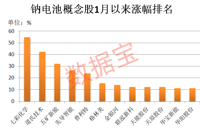 据证券时报·数据宝统计,目前A股市场布局钠电池产业的公司接近40家。截至1月23日收盘,今年以来钠电池概念股平均上涨9.88%,跑赢同期上证指数5个百分点以上。七彩化学、道氏技术、五矿新能、先导智能、普利特累计涨幅超20%。