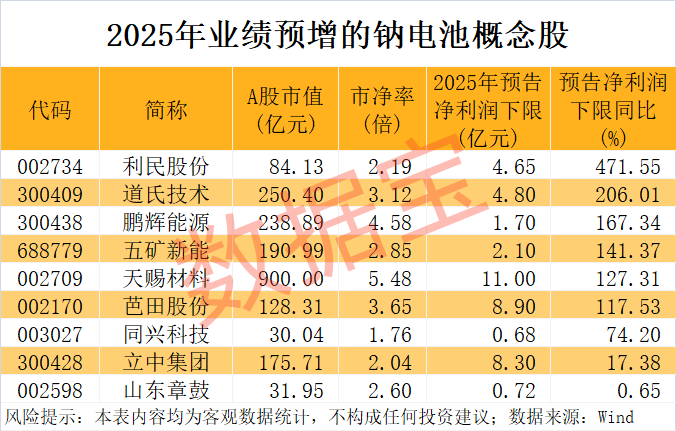 从最新公布的业绩数据来看,按照预告净利润下限计算(无下限则取公告数值),2025年净利润同比增长(含扭亏为盈)的钠电池概念股有9只,包括利民股份、道氏技术、鹏辉能源、五矿新能、天赐材料等。