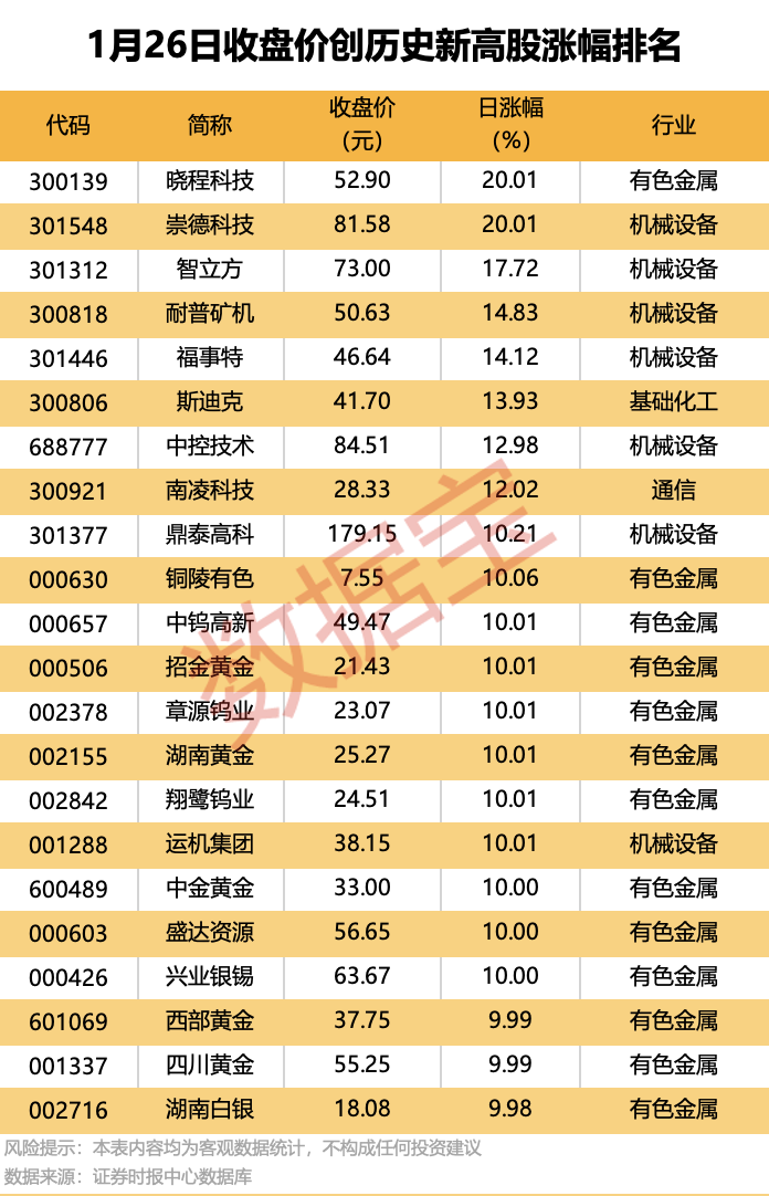 收盘价创历史新高股中,今日股价平均上涨6.19%,涨停的有晓程科技、崇德科技、铜陵有色等,涨幅居前的有智立方、耐普矿机、福事特等。