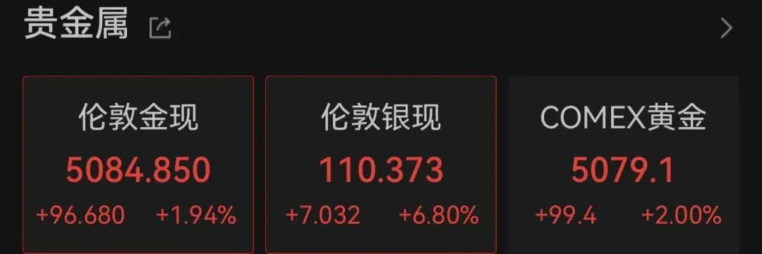 黄金与白银则仍维持高位,截至发稿,现货黄金涨近2%,现货白银涨逾6%。