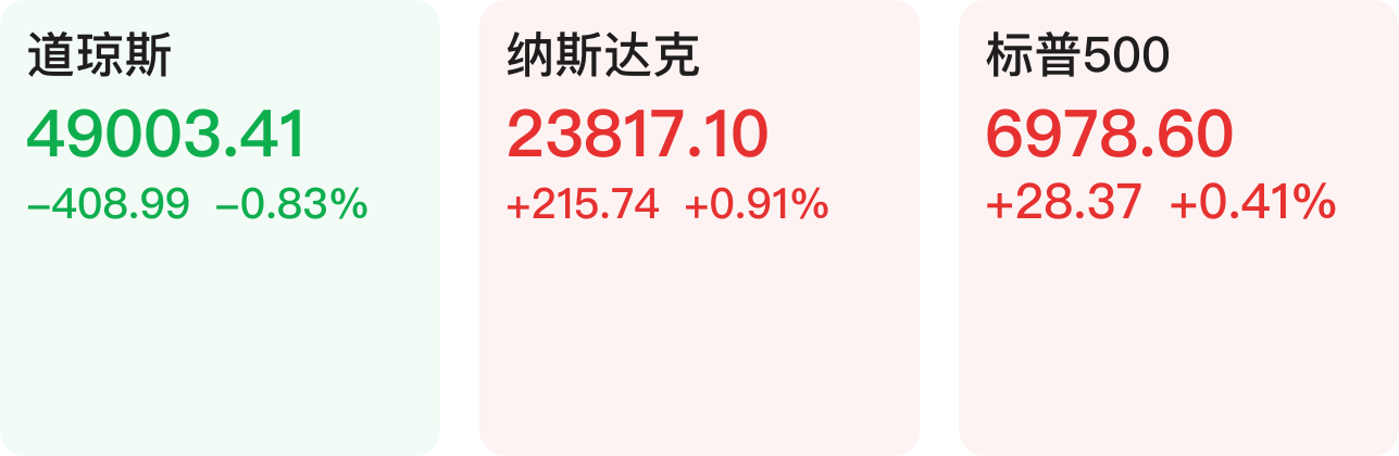 当地时间1月27日,美股三大指数涨跌不一,道指跌0.83%,纳指涨0.91%,标普500指数涨0.41%。大型科技股普涨,英特尔涨超3%,亚马逊、微软涨超2%,苹果、英伟达涨超1%。纳斯达克中国金龙指数收涨0.48%,金山云涨超8%,爱奇艺、哔哩哔哩涨超3%,阿里巴巴、蔚来小幅上涨。