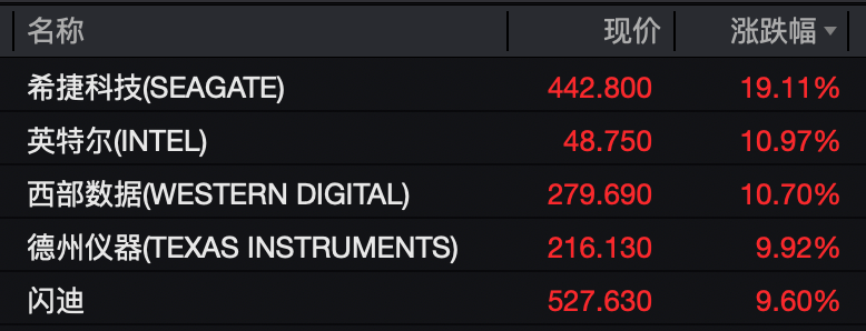存储概念股走高,希捷科技涨超19%,西部数据涨超10%,闪迪涨超9%,美光科技涨超6%。大型科技股走势分化,英伟达涨超1%,谷歌、微软小幅上涨,亚马逊、苹果微幅下跌。