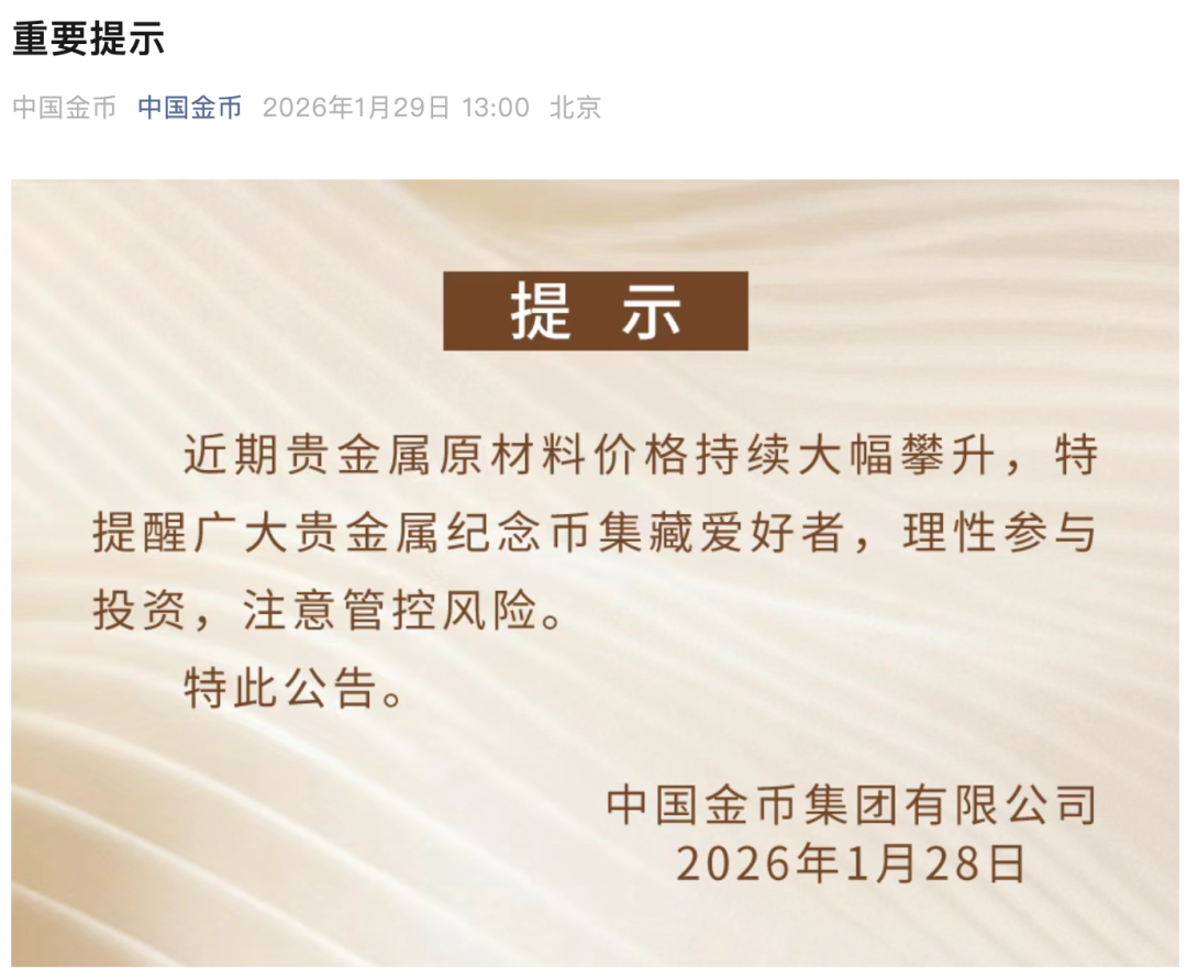1月29日消息,中国金币集团有限公司发布提示:近期贵金属原材料价格持续大幅攀升,特提醒广大贵金属纪念币集藏爱好者,理性参与投资,注意管控风险。