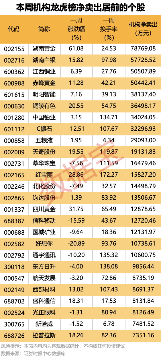 一周机构累计净卖出的个股中,19股金额均超1亿元,前四名均为有色金属股,其中净卖出金额最多的是湖南黄金。该股本周累计上涨61.08%,一周换手率为24.53%,因日涨幅偏离值达10.78%、连续三个交易日内涨幅偏离值累计达21.50%、连续三个交易日内涨幅偏离值累计达22.04%等3次上榜龙虎榜,买卖居前营业部中机构合计净卖出7.88亿元;同时上榜的还有深股通专用席位,净买入861.96万元;营业部席位一周合计净买入19.05亿元。