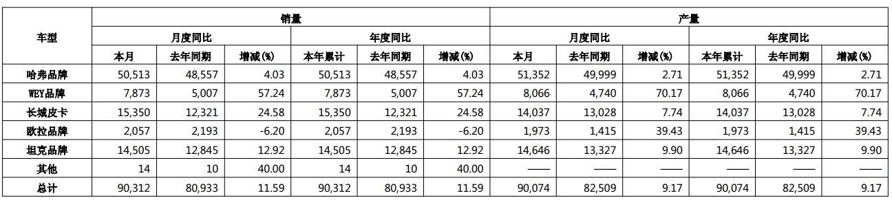 长城汽车:1月汽车销量9.03万辆 同比增长11.59%