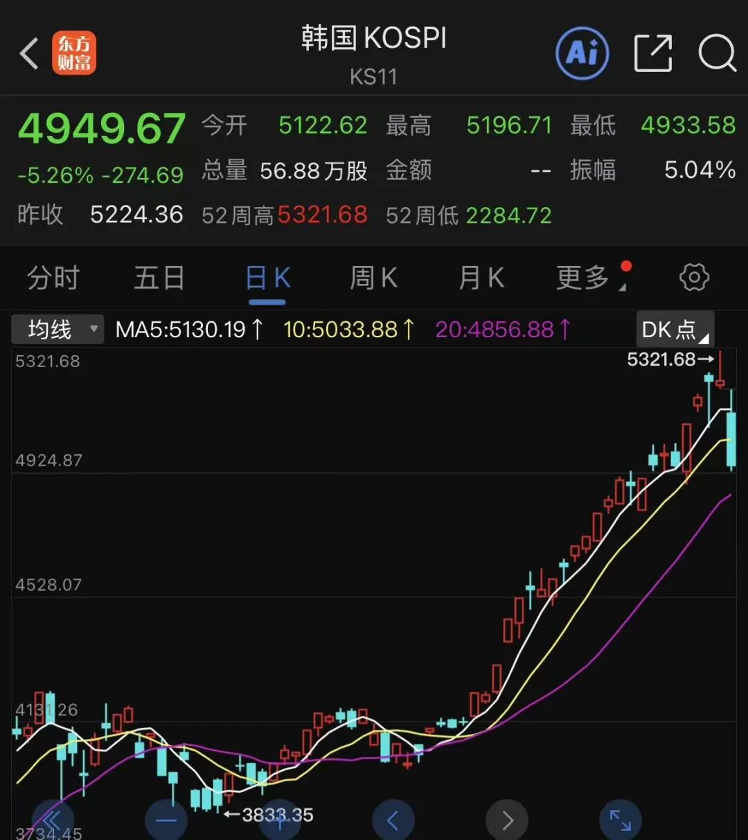 2月2日,韩国股市遭遇重挫。韩国综合股价指数(KOSPI)收于4949.67点,比前一交易日下跌274.69点,跌幅达5.26%,一度启动暂停程序化交易的“临时停牌”措施。此前,KOSPI连续刷新历史新高,1月27日收盘价首次突破5000点。