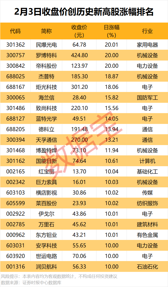 从股价表现看,收盘价创历史新高股中,今日股价平均上涨8.23%,涨停的有民爆光电、罗博特科、帝科股份等,涨幅居前的有杰普特、炬光科技、海兰信等。
