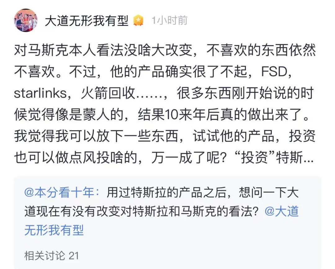 “马斯克的产品确实很了不起,FSD,starlinks,火箭回收……很多东西刚开始说的时候觉得像是蒙人的,结果10来年后真的做出来了。”段永平写道,“我觉得我可以放下一些东西,试试他的产品,投资也可以做点风投啥的。”
