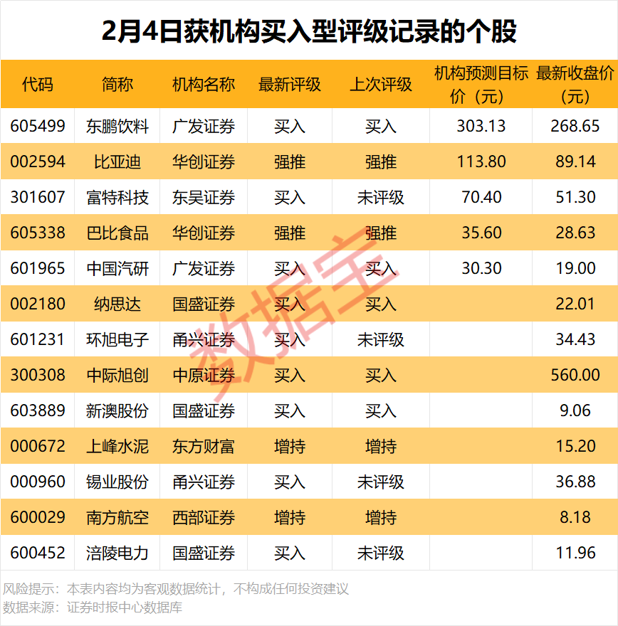 获机构买入型评级个股中,共有5条评级记录给出预测目标价,上涨空间均超10%。中国汽研上涨空间最高,2月4日广发证券预计公司目标价为30.30元,上涨空间达59.47%;上涨空间较高的个股还有富特科技、比亚迪等,分别为37.23%、27.66%。
