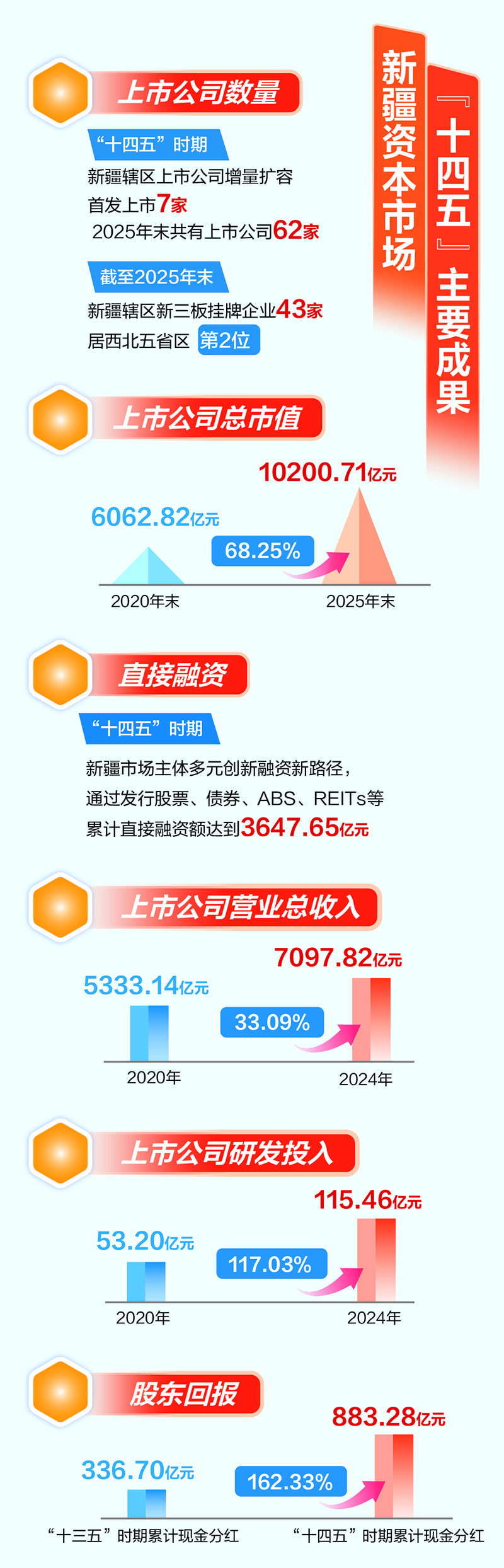上市公司不断加大投资者回报力度,增强市场信心。数据显示,“十四五”时期,新疆上市公司累计现金分红883.28亿元,较“十三五”时期的336.70亿元增长162.33%。