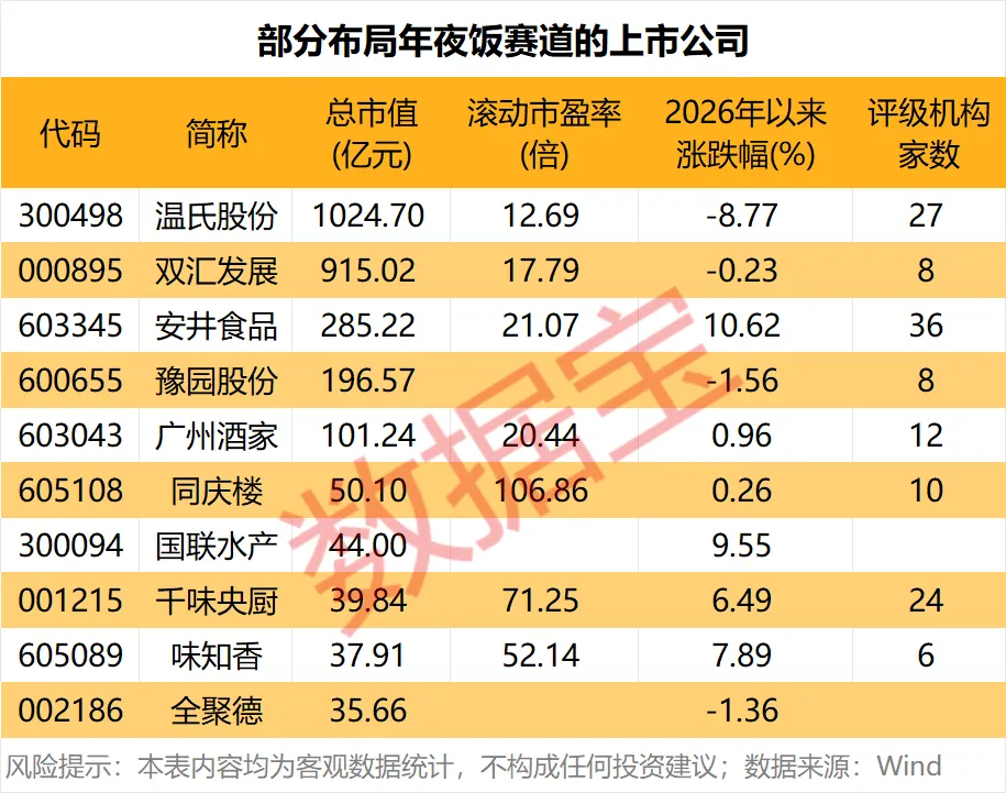 人民财讯2月15日电,据证券时报·数据宝统计,已有多家餐饮相关上市公司针对年夜饭场景或预制菜礼盒进行了相应的布局及准备。根据记者不完全统计,豫园股份、双汇发展、安井食品、味知香、温氏股份、国联水产等上市公司,旗下均有年夜饭预制菜礼盒产品。
