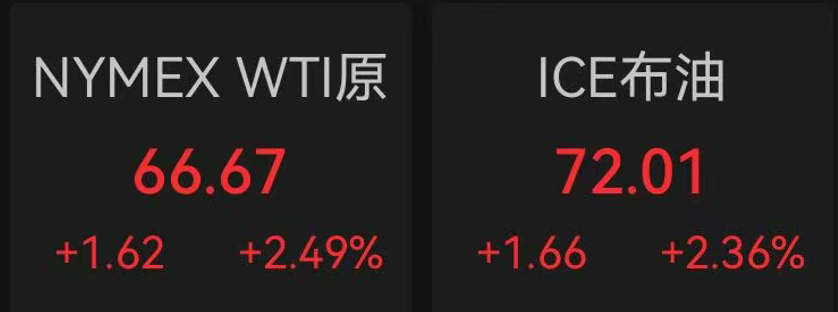 值得注意的是,当天美股能源股大幅走高,其中,西方石油大涨近10%。与此同时,国际油价大幅收涨,Wind数据显示,NYMEX WTI原油收涨近2.5%,ICE布油收涨超2.2%。