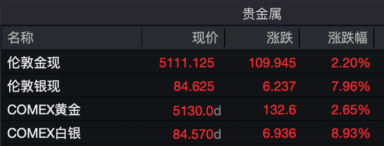 黄金白银飙涨。国际现货黄金收涨2.2%,最新报5111.125美元/盎司;现货白银报84.625美元/盎司,涨幅接近8%。