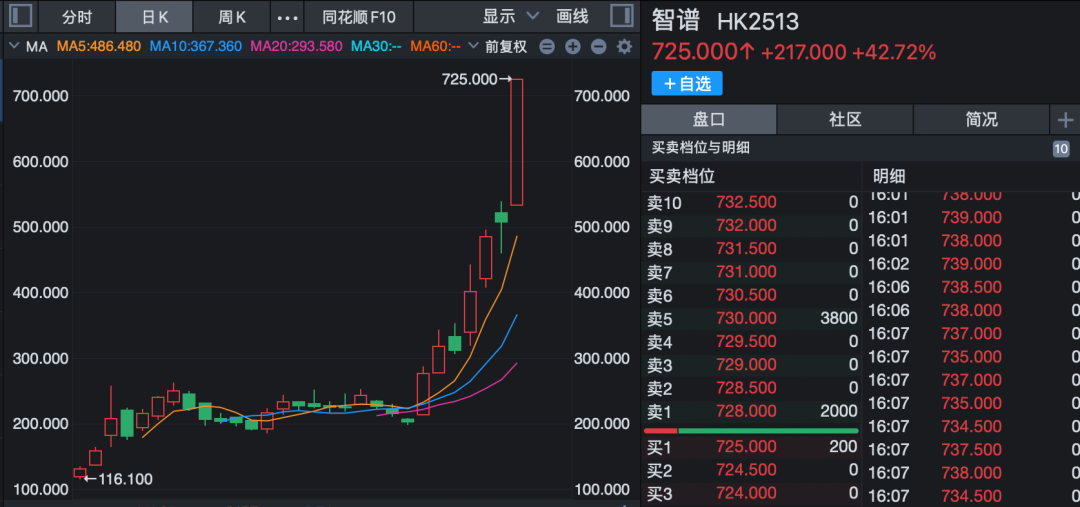 2月20日(周五),智谱股价单日大涨42.72%,报725港元/股,股价再创新高,总市值达3232亿港元。