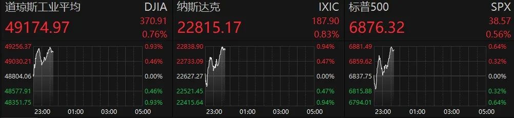 2月24日晚间,美股三大指数高开后盘中拉升,截至发稿,道指涨0.76%,纳指涨0.83%,标普500指数涨0.56%。
