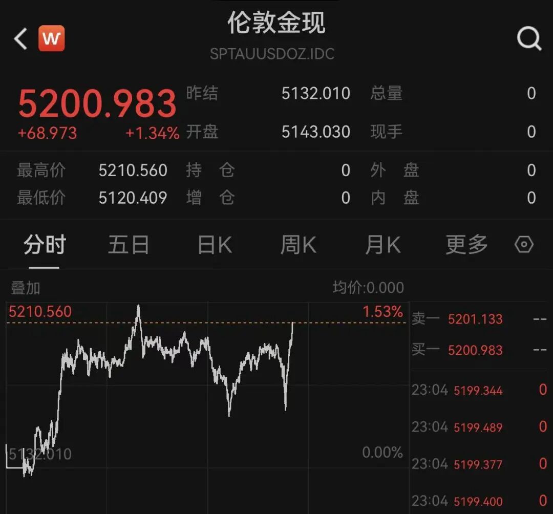 黄金与白银也集体拉升,截至发稿,现货黄金涨逾1%,每盎司价格升至5200美元上方,现货白银更是大涨超4%,美国银行称,白银今年可能再度涨至每盎司100美元以上。