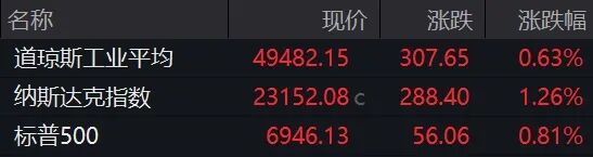 大型科技股全线上涨,奈飞涨约6%,微软、Meta涨超2%,英伟达、英特尔、特斯拉、亚马逊涨超1%,苹果、谷歌小幅上涨。