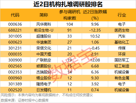 近两个交易日(2月25日至2月26日)共有22家公司公告机构调研记录,其中,12股有10家以上机构扎堆调研,风华高科最受关注,有104家机构调研;其次是前沿生物-U,有91家机构调研。