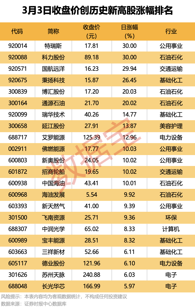 收盘价创历史新高股中,今日股价平均上涨8.39%,涨停的有特瑞斯、科力股份、国航远洋等,涨幅居前的有秉扬科技、瑞华技术、延江股份等。