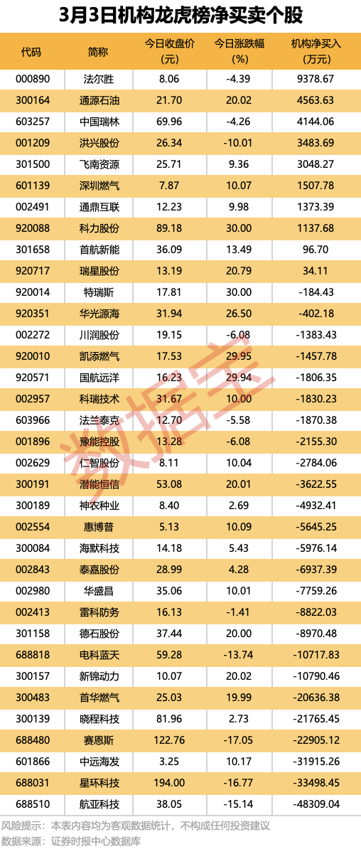 今日龙虎榜中,净买入个股有10只,净卖出的个股为25只。8股净买入金额均超千万元,法尔胜获机构净买入9378.67万元,居首;其次是通源石油,机构净买入金额为4563.63万元。