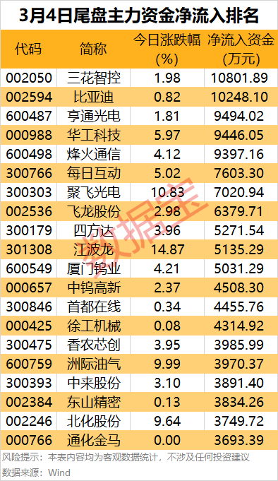 从个股来看,11股尾盘主力资金净流入金额均超5000万元,三花智控和比亚迪尾盘主力资金净流入均超1亿元。