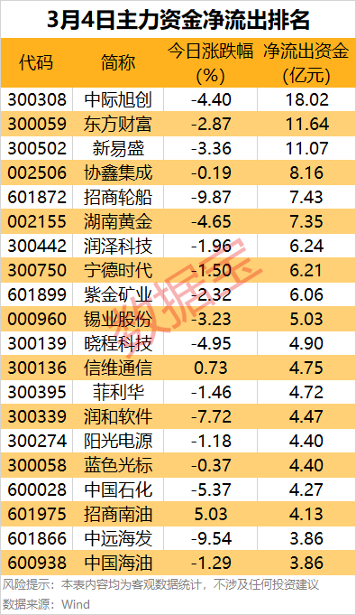 光模块龙头股中际旭创主力资金净流出18.02亿元,居首;东方财富和新易盛主力资金净流出均超11亿元;热门股招商轮船跌近10%,主力资金净流出7.43亿元。