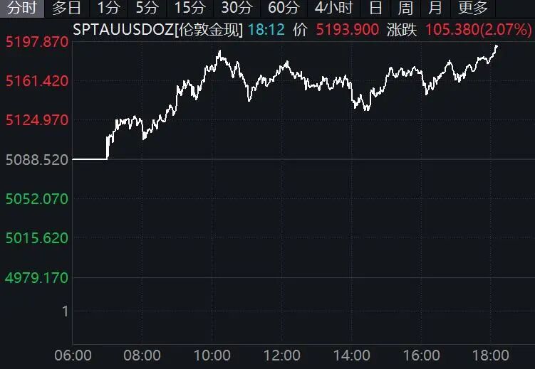 美元指数下跌,国际黄金、白银盘中拉升,截至发稿,现货黄金涨超2%,站上5190美元/盎司,现货白银涨幅扩大至逾5%。