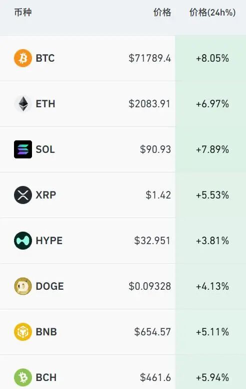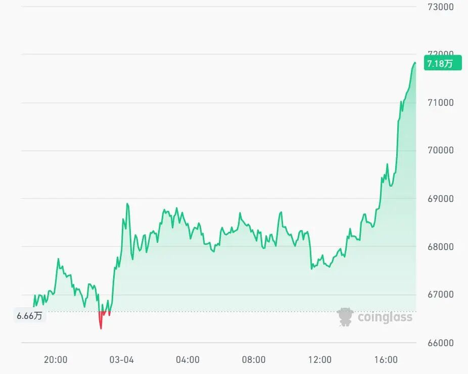 加密货币集体拉升,比特币大涨8%,站上71000美元;以太坊涨近7%。根据CoinGlass数据统计,最近24小时,全球共有超12万人爆仓。