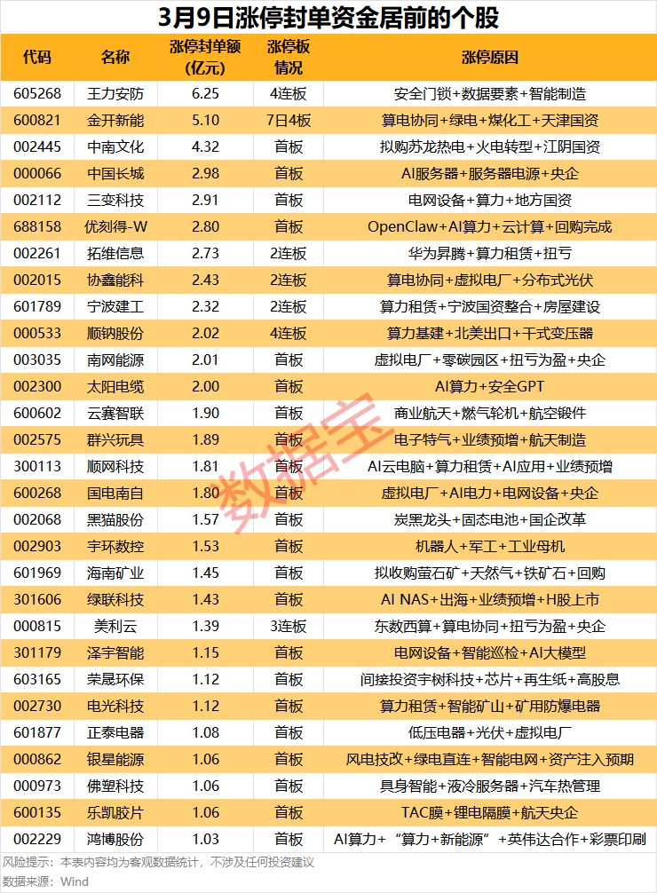 以封单金额计算,王力安防、金开新能、中南文化等涨停板封单资金最多,分别有6.25亿元、5.10亿元、4.32亿元。