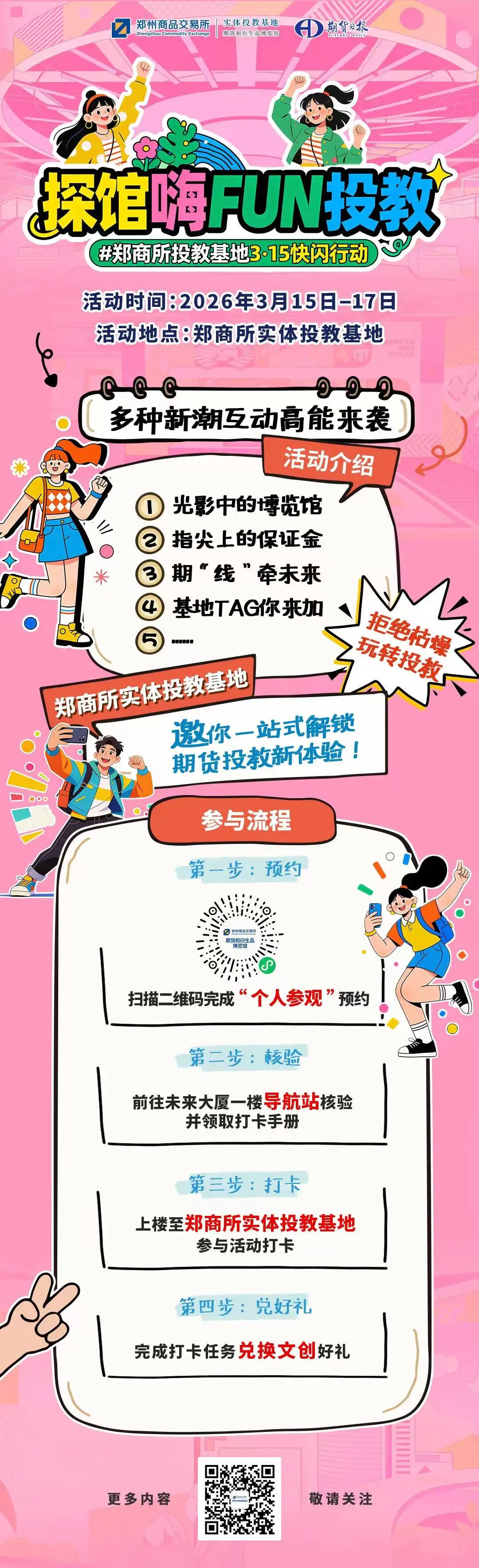 春风送暖,万物复苏,投资者教育的“新玩法”正在河南省郑州市悄然酝酿。在国际消费者权益日到来之际,为深入贯彻落实2026年证监会系统工作会议精神,积极发挥面向公众的公益性、专业化平台作用,切实提升投资者风险防范意识和自我保护能力,一场别开生面的“探馆嗨FUN投教”——郑商所投教基地“3·15”快闪行动将于3月15日至17日在郑商所投资者教育基地——期货和衍生品博览馆(下称“郑商所实体投教基地”)精彩启幕。