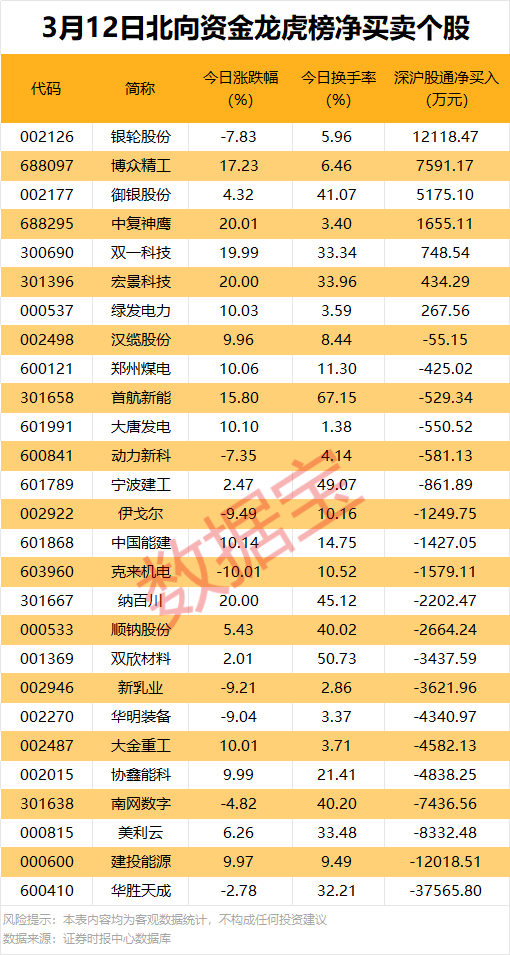 今日龙虎榜现身个股中,7股获北向资金净买入。净买入居首的是银轮股份,金额为1.21亿元;博众精工、御银股份、中复神鹰等紧随其后,净买入金额均超1000万元。