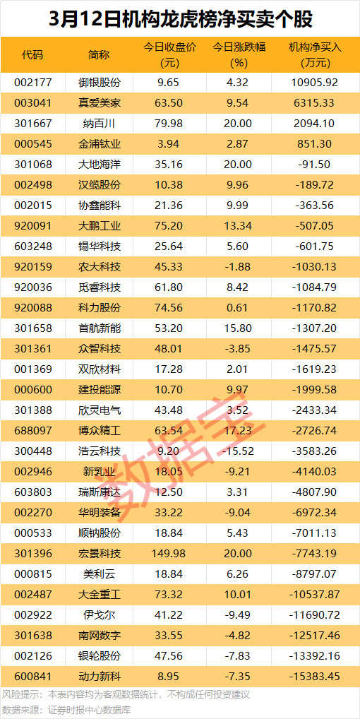 机构净卖出个股中,动力新科遭机构净卖出1.54亿元,居首;紧随其后是银轮股份、南网数字、伊戈尔和大金重工,净卖出金额均超1亿元。