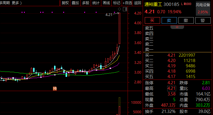新能源产业继续全面上攻,风电设备方向再度领涨,板块指数一度放量涨逾4%,连续第8日上涨,再创近4年新高,半日成交超昨日全天成交。通裕重工(300185)临近午间收盘20%涨停,超220万手买单封板,天能重工、天顺风能等涨停或涨超10%。