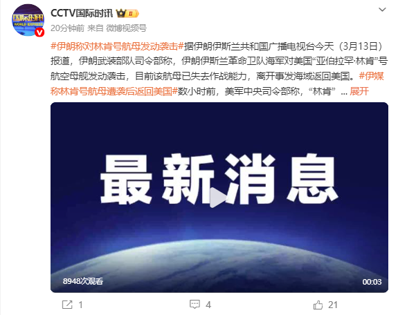 伊媒称林肯号航母遭袭后返回美国