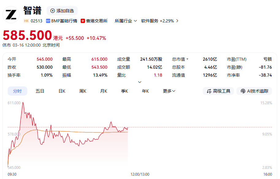 受GLM-5-Turbo带动,智谱(02513.HK)今日股价大涨,早盘一度涨超16%,截至中午收盘,该股涨超10%。