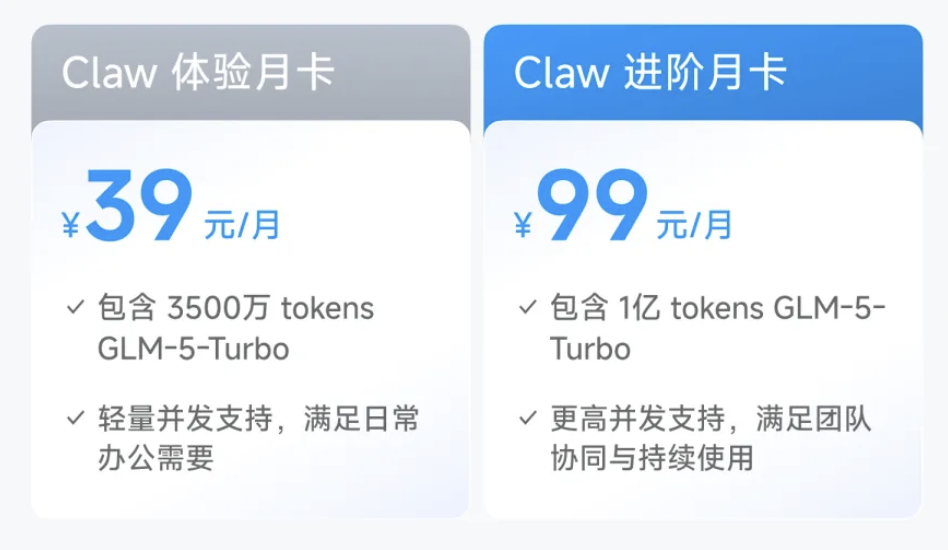 在发布专为龙虾场景深度优化的通用大模型GLM-5-Turbo的同时,智谱也同步上调了GLM-5-Turbo的API价格,涨幅为20%。此外,智谱还推出了基于GLM-5-Turbo的“龙虾套餐”。其中,Claw体验月卡为39元/月,包含3500万tokens,可满足日常办公需要;Claw进阶月卡为99元/月,包含1亿tokens,可满足团队协同与持续使用。