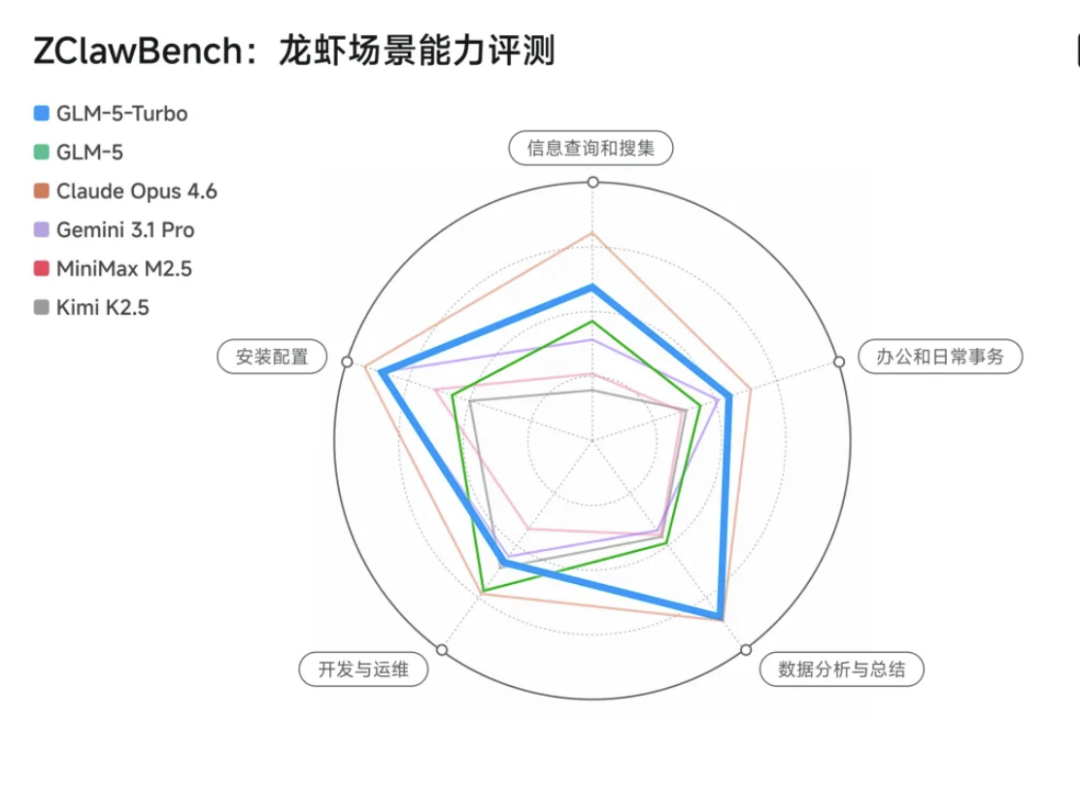 基于该基准的评测结果显示,GLM-5-Turbo在OpenClaw场景中的表现相比GLM-5提升显著,在多项关键任务上整体领先于多家主流模型。
