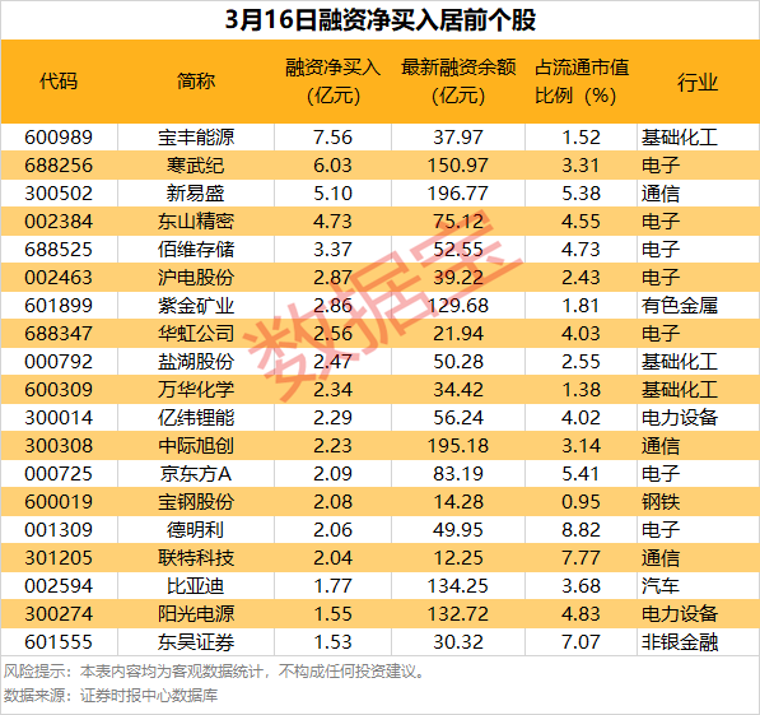 宝丰能源融资净买入额居首,当日净买入7.56亿元;其次是寒武纪、新易盛,融资净买入金额分别为6.03亿元、5.1亿元。融资净买入金额居前的还有东山精密、佰维存储、沪电股份等。