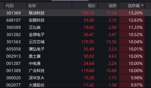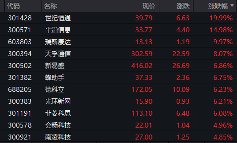主要行业板块和赛道方面,若按照申万一级行业划分,通信板块领涨,板块涨幅接近3%,世纪恒通(301428)20%涨停,平治信息大涨近15%,瑞斯康达涨停,天孚通信、新易盛等多只明星股亦大幅上涨。