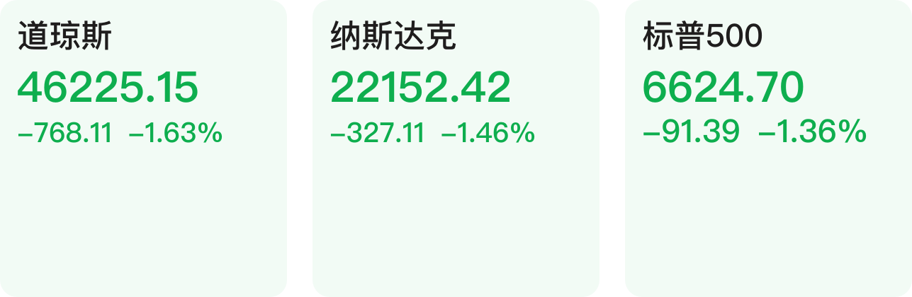 美股三大指数集体收跌,道指跌1.63%,纳指跌1.46%,标普500指数跌1.36%。大型科技股多数下跌,亚马逊跌超2%,微软、苹果、台积电、特斯拉、meta、谷歌跌超1%,AMD涨超1%,英特尔涨超2%。热门中概股多数下跌,纳斯达克中国金龙指数跌2.06%。微博跌超10%,腾讯音乐跌超9%,理想汽车跌超5%,哔哩哔哩跌超4%;金山云涨超12%,新东方涨超3%。