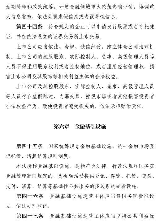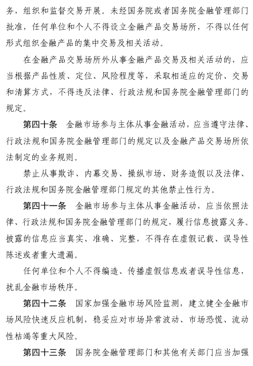 五是优化金融市场体系功能。明确金融市场基本功能、交易原则,健全金融市场稳定机制。建立健全金融基础设施运营主体风险管理制度,强化金融基础设施履约保障。
