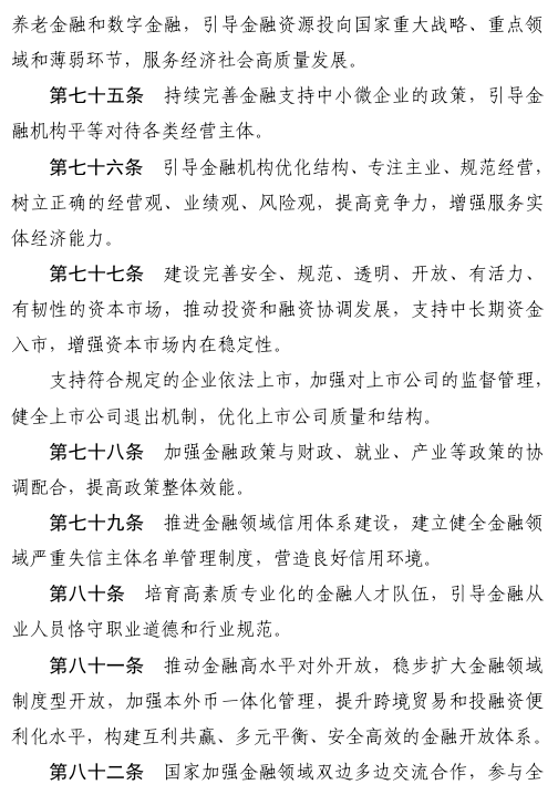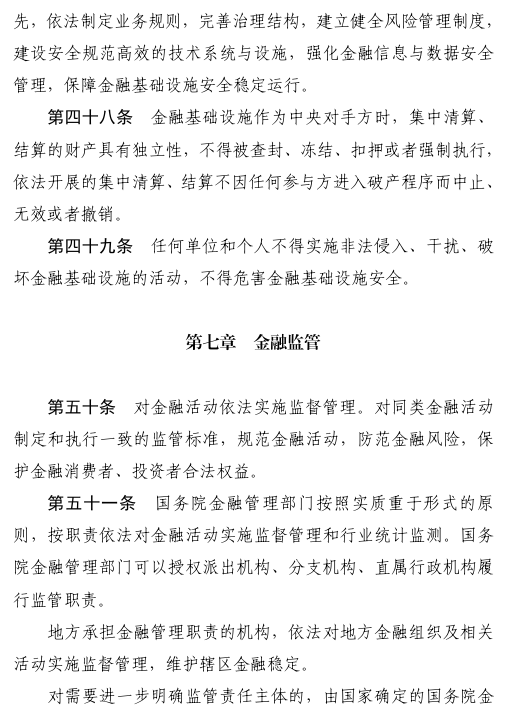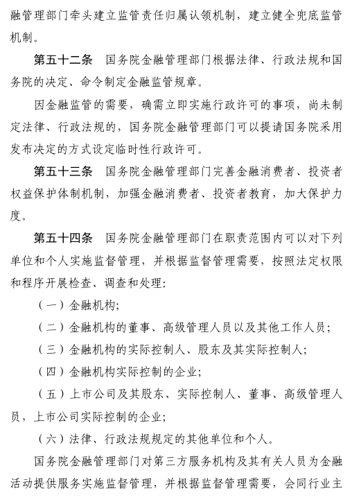 六是全面加强金融监管。明确金融各领域监管职责和央地监管分工,并建立兜底监管机制,实现监管全覆盖。完善金融消费者、投资者权益保护体制机制。同时,对监管协同、履职保障和追责问责提出明确要求。