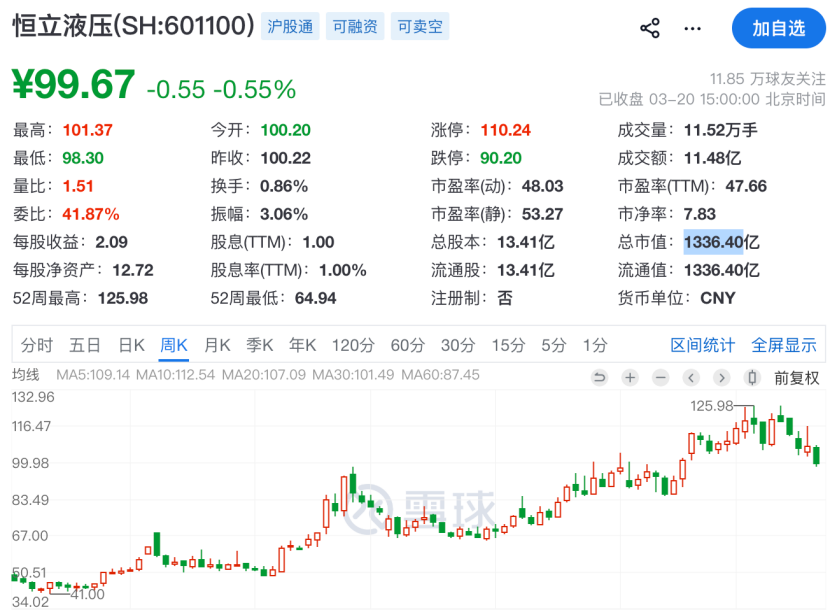 从股价表现来看,恒立液压是A股大牛股,今年1月公司股价一度飙涨至125.98元/股,相较于2024年7月的低点,累计涨幅达207%。但自2026年2月11日以来,恒立液压股价持续调整,截至最新收盘,报99.67元,总市值报1336.4亿元。