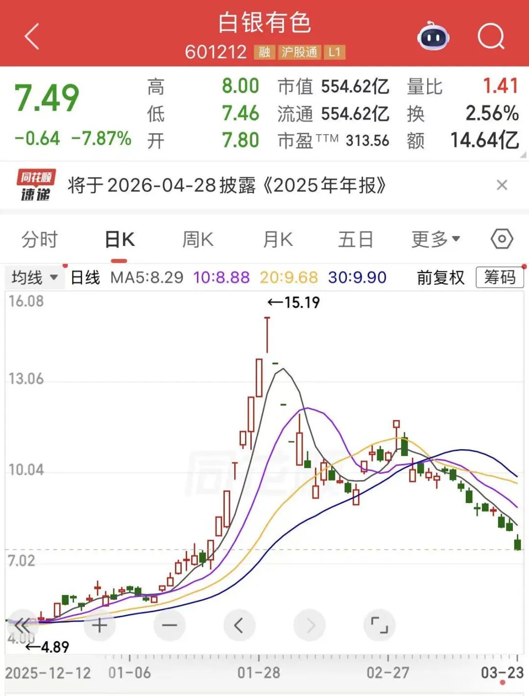 曾经的千亿市值公司白银有色股价也已回调超50%。该股1月29日股价超过15元/股,收盘总市值超1100亿元,最新价7.49元/股。
