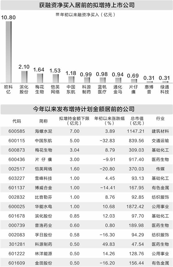 发布增持计划的公司受到融资资金青睐。统计显示,年初以来发布重要股东增持计划的公司获融资净买入金额达到6.58亿元;16家获得融资净买入,欧科亿、滨化股份、梅花生物、恺英网络、中国东航5家获净买入金额均超过1亿元。