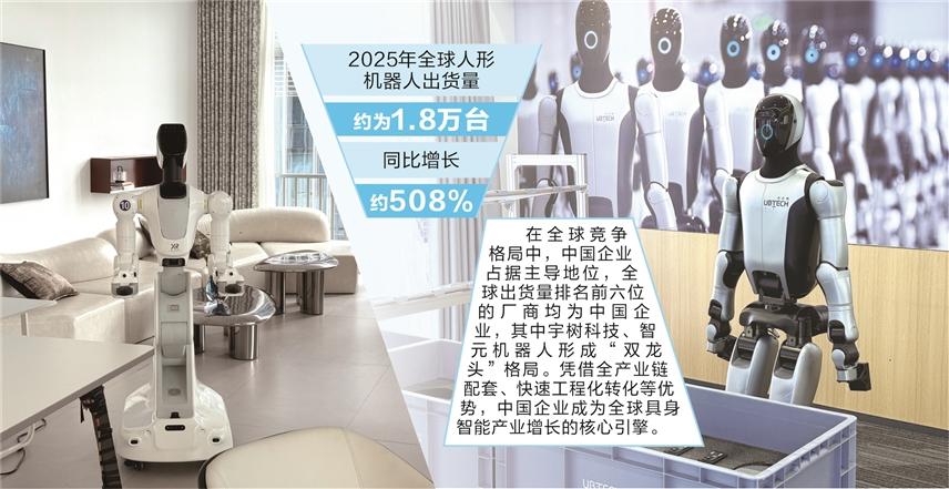 具身智能产业在2025年实现跨越式发展,其中人形机器人出货量已初具规模。知名咨询公司IDC发布的《全球人形机器人市场分析》显示,2025年全球人形机器人出货量约为1.8万台,同比增长约508%。在全球竞争格局中,中国企业占据主导地位,全球出货量排名前六位的厂商均为中国企业,其中宇树科技、智元机器人形成“双龙头”格局。凭借全产业链配套、快速工程化转化等优势,中国企业成为全球具身智能产业增长的核心引擎。